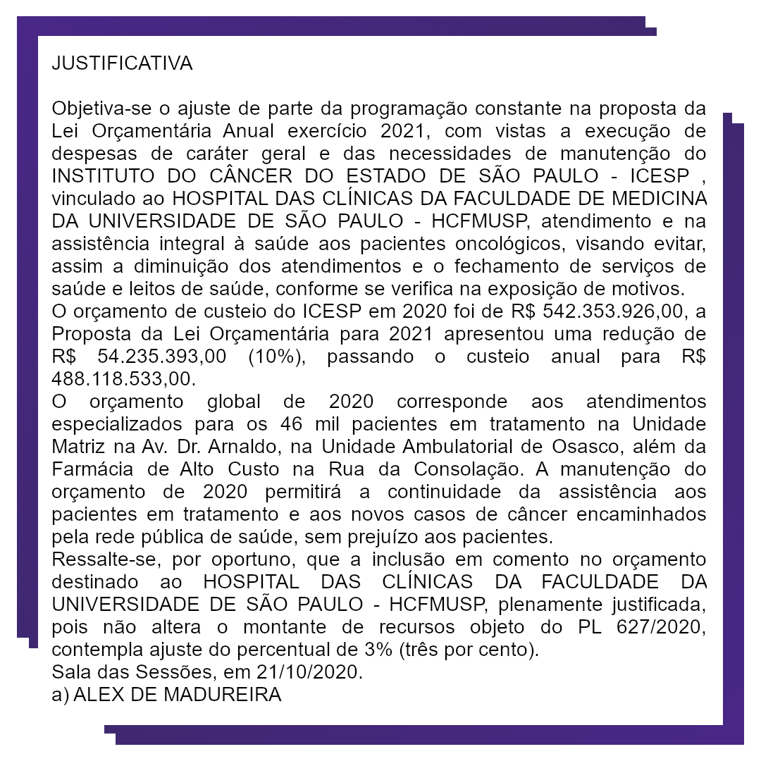 “Acabo de visitar o Icesp, Instituto do Câncer do Estado de São Paulo. Fiquei muito impactada com o importante serviço prestado à população. Esse trabalho corre riscos, pois o orçamento para 2021 corta mais de 50 milhões da verba prevista para 2020.
